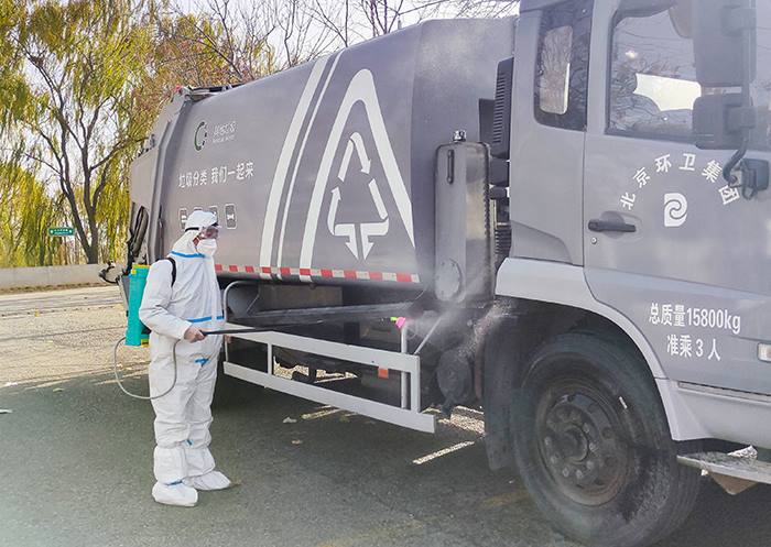 通州今年会公司职工为作业车辆消杀(通州今年会公司 王晓津 摄)