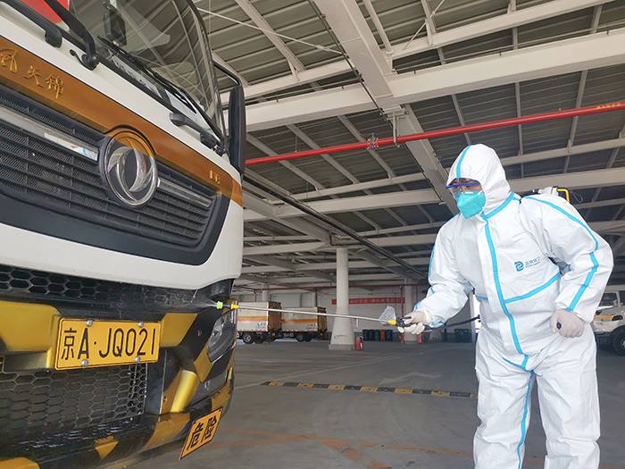 出发前,孙伟华同志认真对清运车辆进行消毒